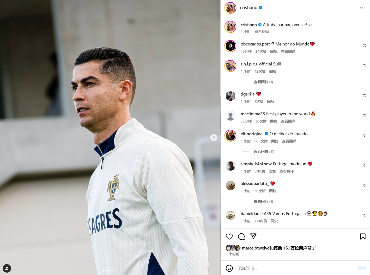 3月19日訊 不久前,正在葡萄牙國家隊備戰(zhàn)的C羅更新了社交媒體。C羅曬出了自己的訓練照,配文寫道:“為了勝利而工作!”本期國家隊比賽日,葡萄牙將會迎來歐國聯1/決賽,將在在3月21日和3月24日的客場和主場對陣丹麥隊。 本文標簽: 足球 利雅得勝利 國家隊 葡萄牙 C羅