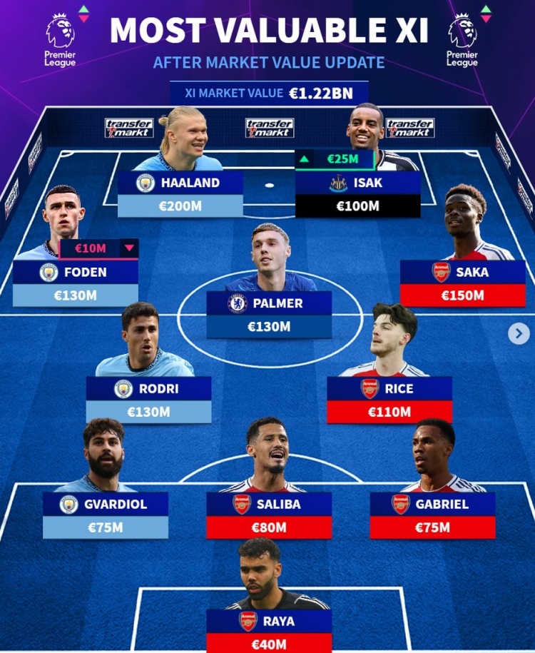 3月19日訊 《轉會市場》更新了英超球員身價,并列出了英超最新身價最貴陣容,曼城和阿森納共計9席。
