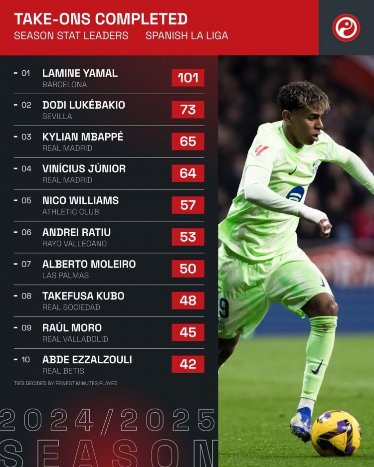 3月19日訊 國(guó)家隊(duì)比賽周到來(lái),西甲也暫時(shí)告一段落,squakwa統(tǒng)計(jì)了本賽季西甲成功過(guò)人情況,亞馬爾斷崖領(lǐng)跑。