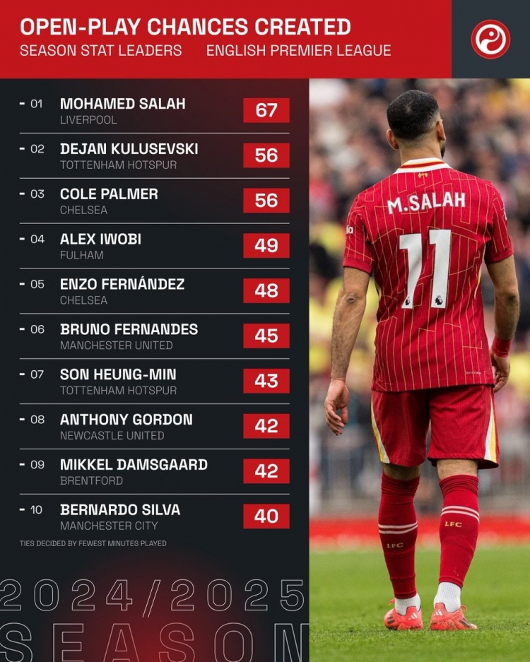 本賽季英超運動戰(zhàn)創(chuàng)造機會榜: