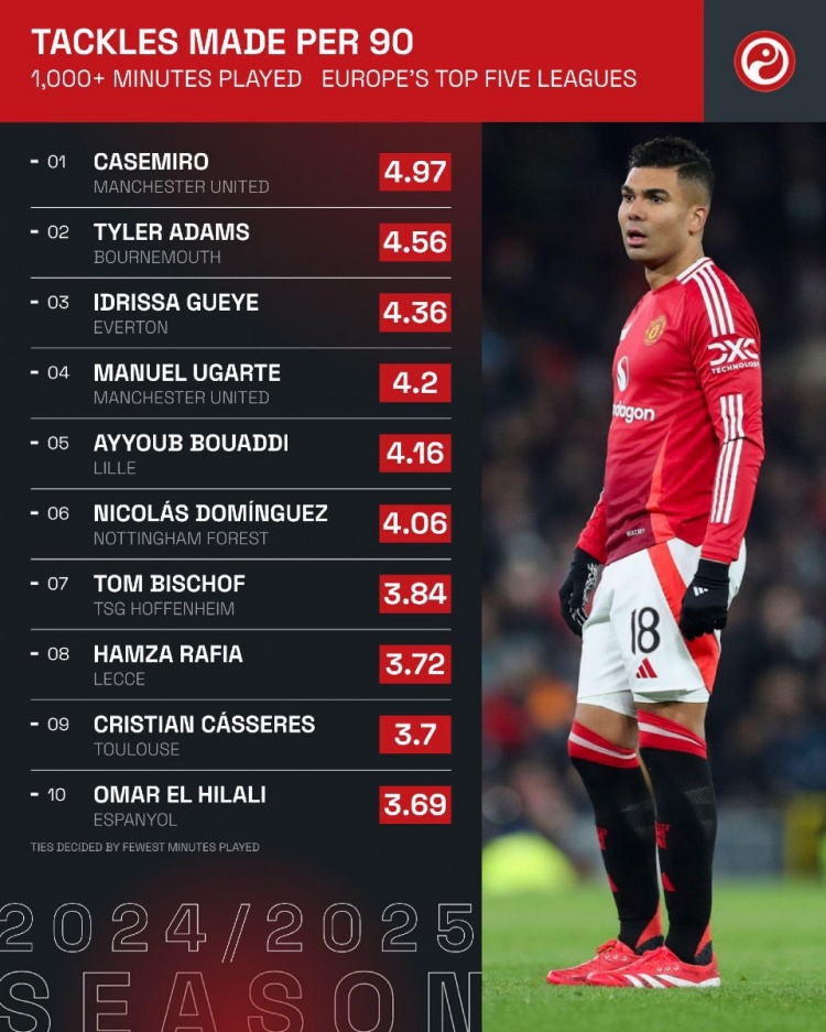 3月19日訊 Squawka統(tǒng)計了本賽季球員在五大聯(lián)賽每90分鐘完成搶斷的次數(shù),并列出榜單,卡塞米羅4.97次居首,亞當斯、蓋耶二三位。