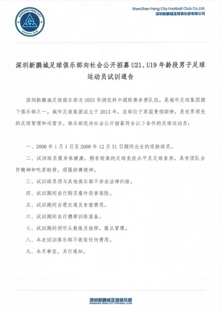 深圳新鵬城足球俱樂部公開招募U21、U19、U17年齡段男子足球運動員試訓(xùn)通告