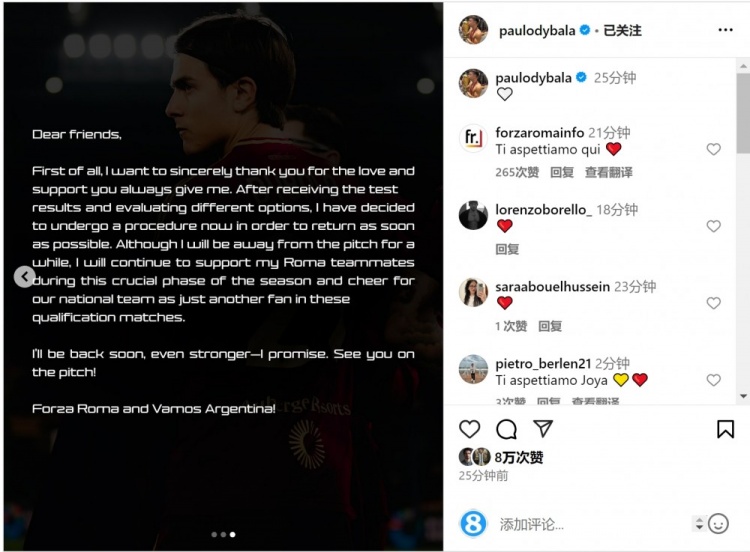 3月20日訊 羅馬官方確認迪巴拉肌腱受傷,將在未來幾天接受手術。迪巴拉社媒發(fā)文感謝球迷的支持,并表示很快就會回歸。
