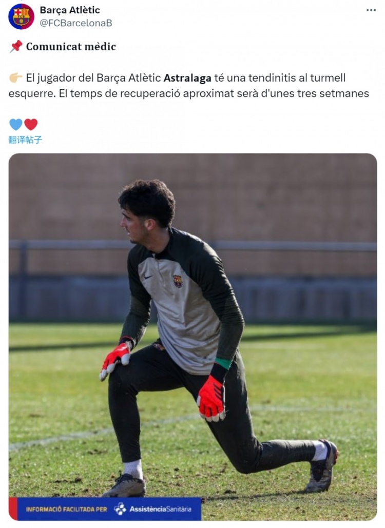 巴薩官方發(fā)布醫(yī)療公告,確認(rèn)20歲門(mén)將阿斯特拉拉加左腳踝患有肌腱炎,大約需要三周的時(shí)間來(lái)恢復(fù)。