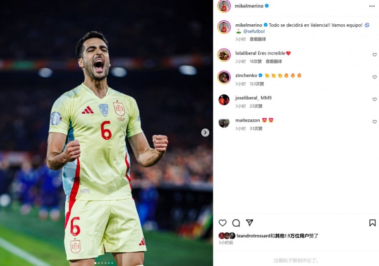 3月21日訊 在歐國聯(lián)1/4決賽首回合,西班牙2-2戰(zhàn)平荷蘭。本場比賽梅里諾替補(bǔ)登場在傷停補(bǔ)時(shí)階段打進(jìn)絕平進(jìn)球,這也是他繼對陣切爾西打進(jìn)制勝球后連場破門。賽后他也在社媒曬出慶祝照,配文寫道:“一切將在瓦倫西亞決定,讓我們一起加油!”次回合比賽將在3月24日移師西班牙主場進(jìn)行。 本文標(biāo)簽: 足球 英超 阿森納 國家隊(duì) 西班牙