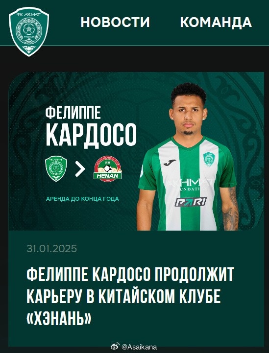 俄羅斯超級聯賽球隊格羅茲尼艾哈邁德(Akhmat Grozny)官方宣布,該隊巴西球員費利佩·卡多佐(Felippe Cardoso)租借加盟中超河南隊。費利佩·卡多佐今年26歲,司職中鋒。2023年前主要在巴西效力,2021年租借日本仙臺隊。2023年加盟葡萄牙卡薩皮亞,2024年夏天加盟格羅茲尼艾哈邁德,為球隊出場17次,打進1球。 本文標簽: 足球 中超 中國足球 河南 轉載