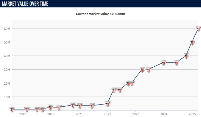 桑謝特在場上司職進(jìn)攻型中場,2015年加入畢爾巴鄂青訓(xùn),2020年正式進(jìn)入一線隊(duì)。近年來桑謝特的身價(jià)一直穩(wěn)步上升,過去半年他的身價(jià)已經(jīng)連續(xù)兩次上漲1000萬歐。