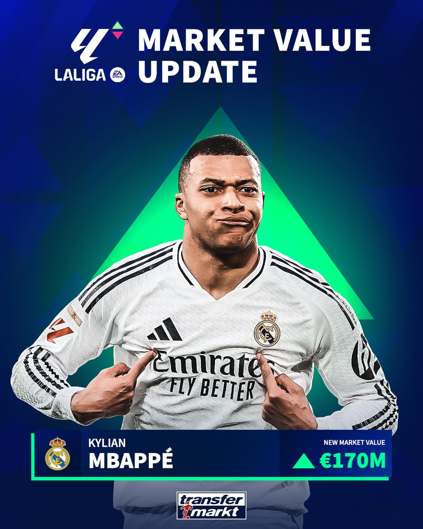 03月21日訊 今日德國轉(zhuǎn)會市場更新了西甲球員身價(jià),姆巴佩上漲1000萬歐至1.7億歐。