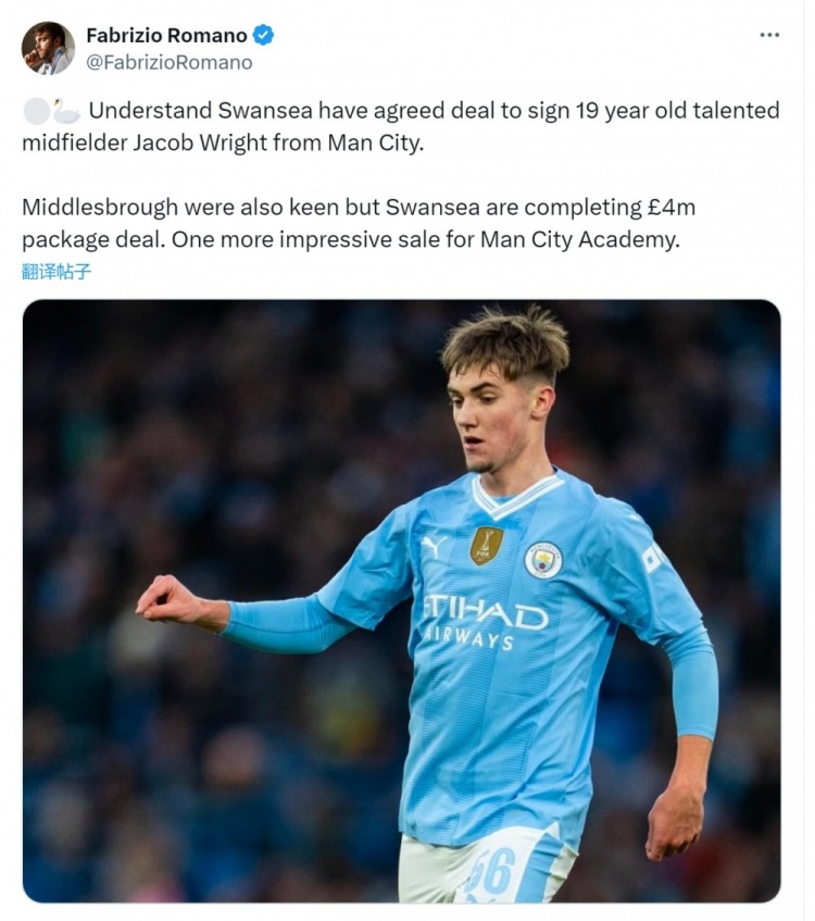 羅馬諾指出,斯旺西和米德?tīng)査贡ざ紝?duì)雅各布-賴(lài)特感興趣,最終斯旺西在競(jìng)爭(zhēng)中勝出,已與曼城就這位小將的轉(zhuǎn)會(huì)達(dá)成協(xié)議,轉(zhuǎn)會(huì)費(fèi)400萬(wàn)英鎊。