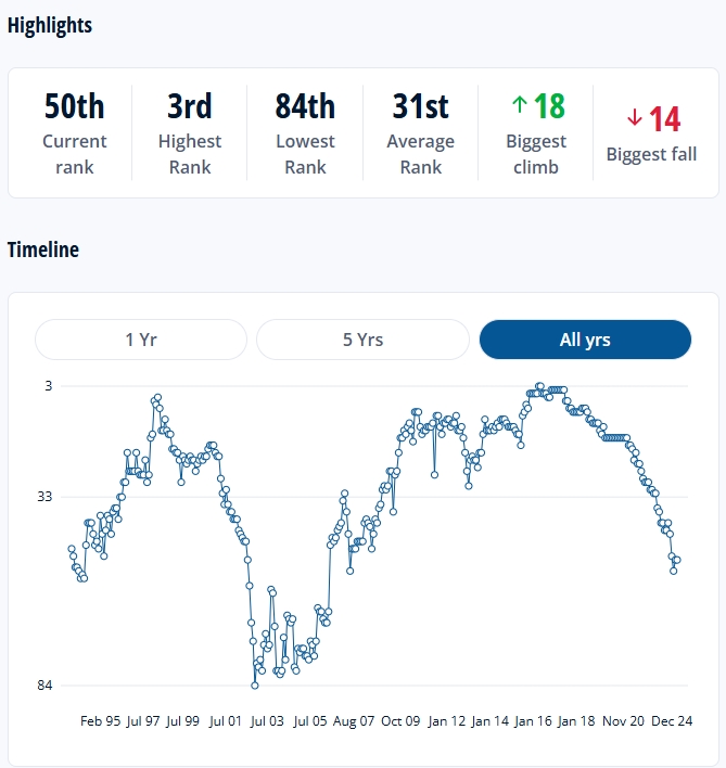 智利的FIFA排名曾在2016年達到隊史最高的第3名,從2021年開始,智利的排名就不斷下降,最低跌至過第53名,如今為第50名。