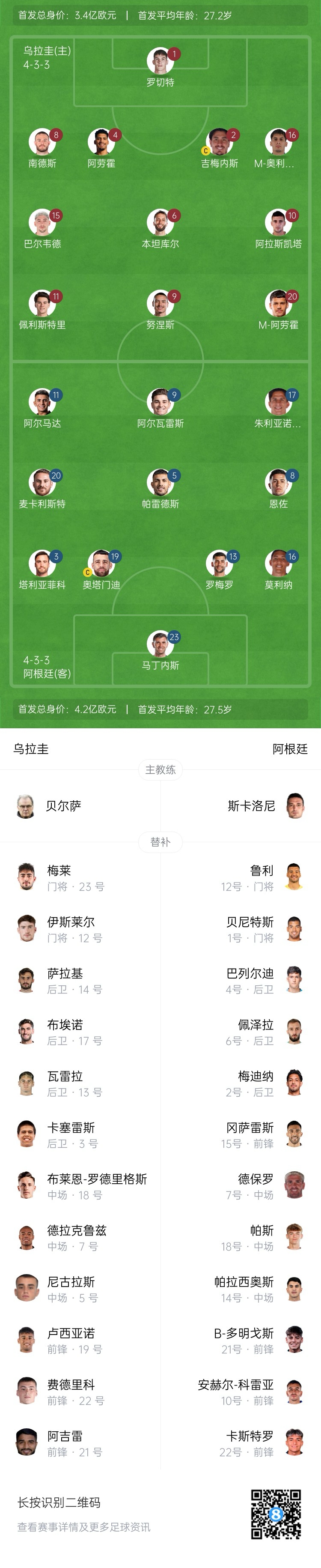阿根廷首發(fā):23-馬丁內(nèi)斯、16-莫利納、13-羅梅羅、19-奧塔門(mén)迪、3-塔利亞菲科、8-恩佐、5-帕雷德斯、20-麥卡利斯特、17-朱利亞諾-西蒙尼、11-阿爾馬達(dá)、9-阿爾瓦雷斯