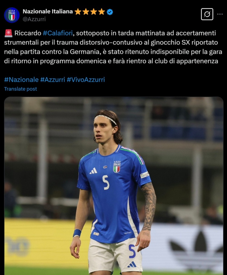 意大利主場(chǎng)1-2負(fù)于德國(guó)。比賽尾聲階段,卡拉菲奧里受傷離場(chǎng)。意大利國(guó)家隊(duì)表示,卡拉菲奧里因傷無(wú)法參與次回合比賽,將返回阿森納。