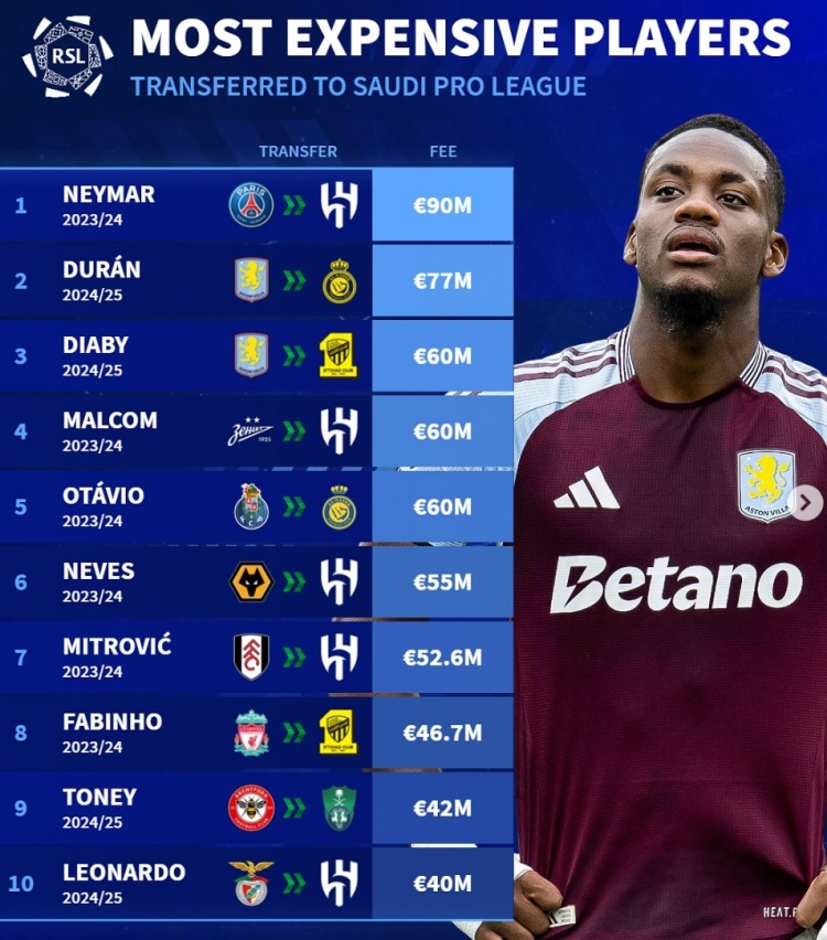 2.杜蘭,維拉→利雅得勝利,24-25賽季,7700萬(wàn)