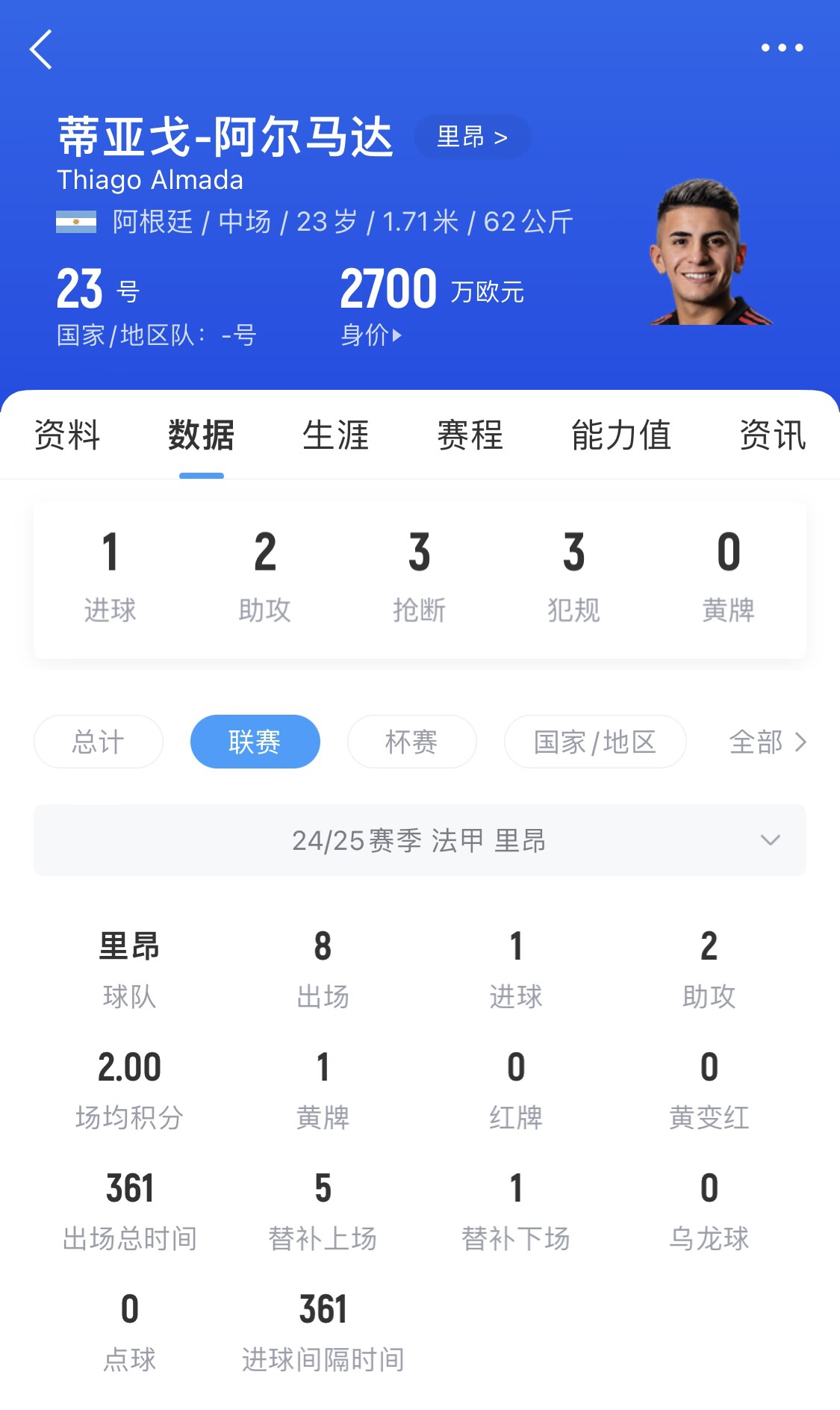 23歲的阿爾馬達(dá)今年租借里昂,3月16日剛收獲法甲首球,近兩場法甲1球2助,球員目前身價(jià)為2700萬歐。