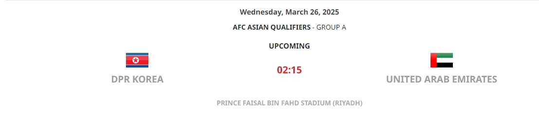 03月22日訊 亞足聯(lián)官網(wǎng)顯示,18強(qiáng)賽第8輪,朝鮮主場(chǎng)對(duì)陣阿聯(lián)酋的比賽將在沙特利雅得進(jìn)行。