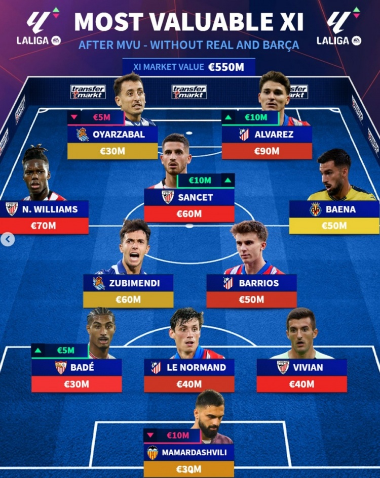 3月22日訊 德轉(zhuǎn)更新了西甲球員身價(jià),并盤(pán)點(diǎn)了除皇馬、巴薩球員之外的西甲最貴陣容,其中阿爾瓦雷斯領(lǐng)銜馬競(jìng)3人在列,具體如下: