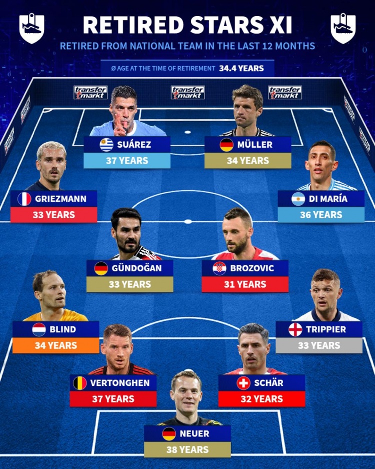 德轉(zhuǎn)列近一年國(guó)家隊(duì)退役球星陣容(平均年齡34.4歲)