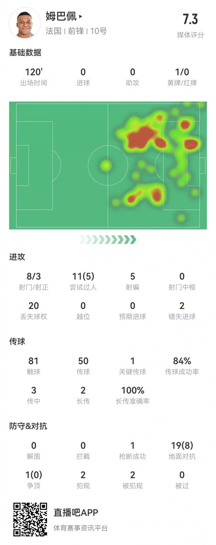 3月24日訊 法國(guó)在歐國(guó)聯(lián)八強(qiáng)戰(zhàn)次回合再戰(zhàn)克羅地亞,姆巴佩本場(chǎng)數(shù)據(jù)如下: