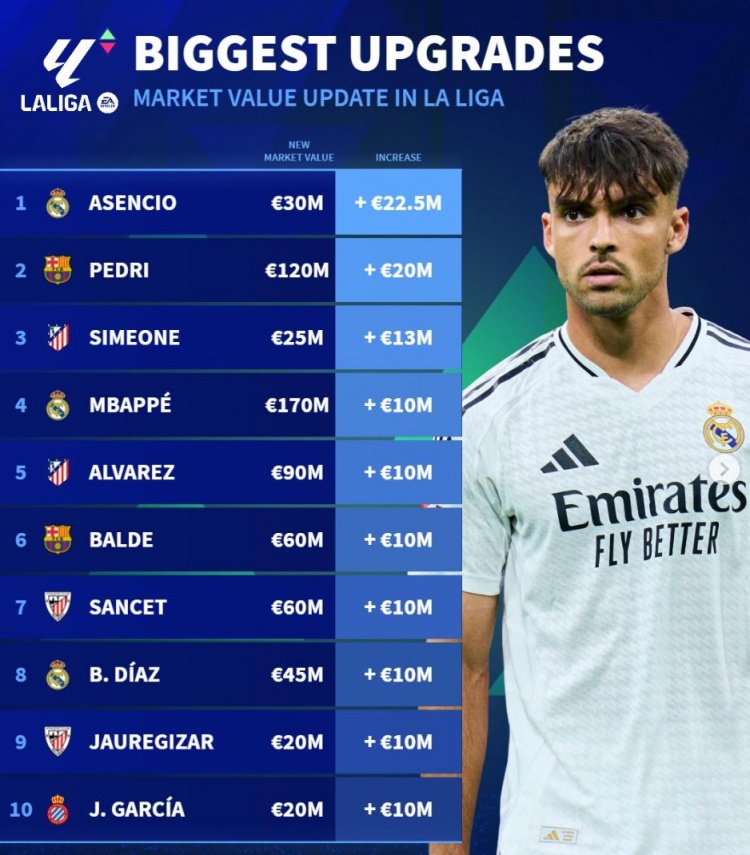 3月24日訊 《轉(zhuǎn)會市場》統(tǒng)計了西甲球員身價更新后的升值最多情況,勞爾-阿森西奧力壓佩德里居首。