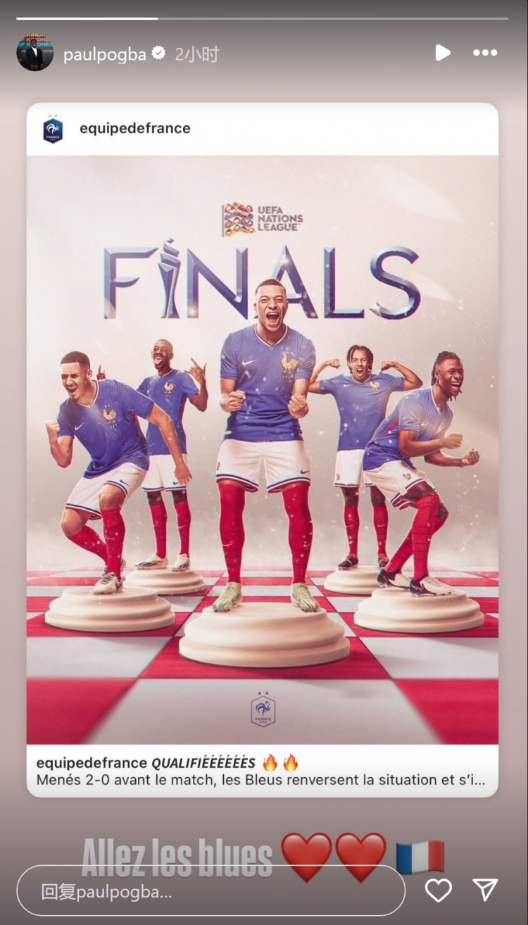 3月24日訊 歐國聯(lián)1/4決賽次回合比賽,法國2-0克羅地亞,兩回合總比分2-2戰(zhàn)平,最終法國在點球大戰(zhàn)中取勝,晉級下一輪。博格巴更新社媒動態(tài),曬出法國隊的海報,祝賀球隊晉級,配文:“加油藍衣軍團!”博格巴職業(yè)生涯至今為法國隊出戰(zhàn)91場比賽,打進11球,助攻9次,幫助球隊贏得2018年世界杯冠軍。博格巴禁賽期結(jié)束后尚未找到球隊,目前在邁阿密自主訓練。 本文標簽: 足球 法國