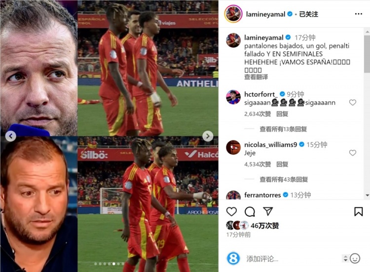 晉級之后,亞馬爾在社交媒體上曬出自己的賽場照,以及范德法特的照片,并寫道:“球褲低穿、打進(jìn)一球、點(diǎn)球失手、晉級半決賽。哈哈哈,西班牙加油!”