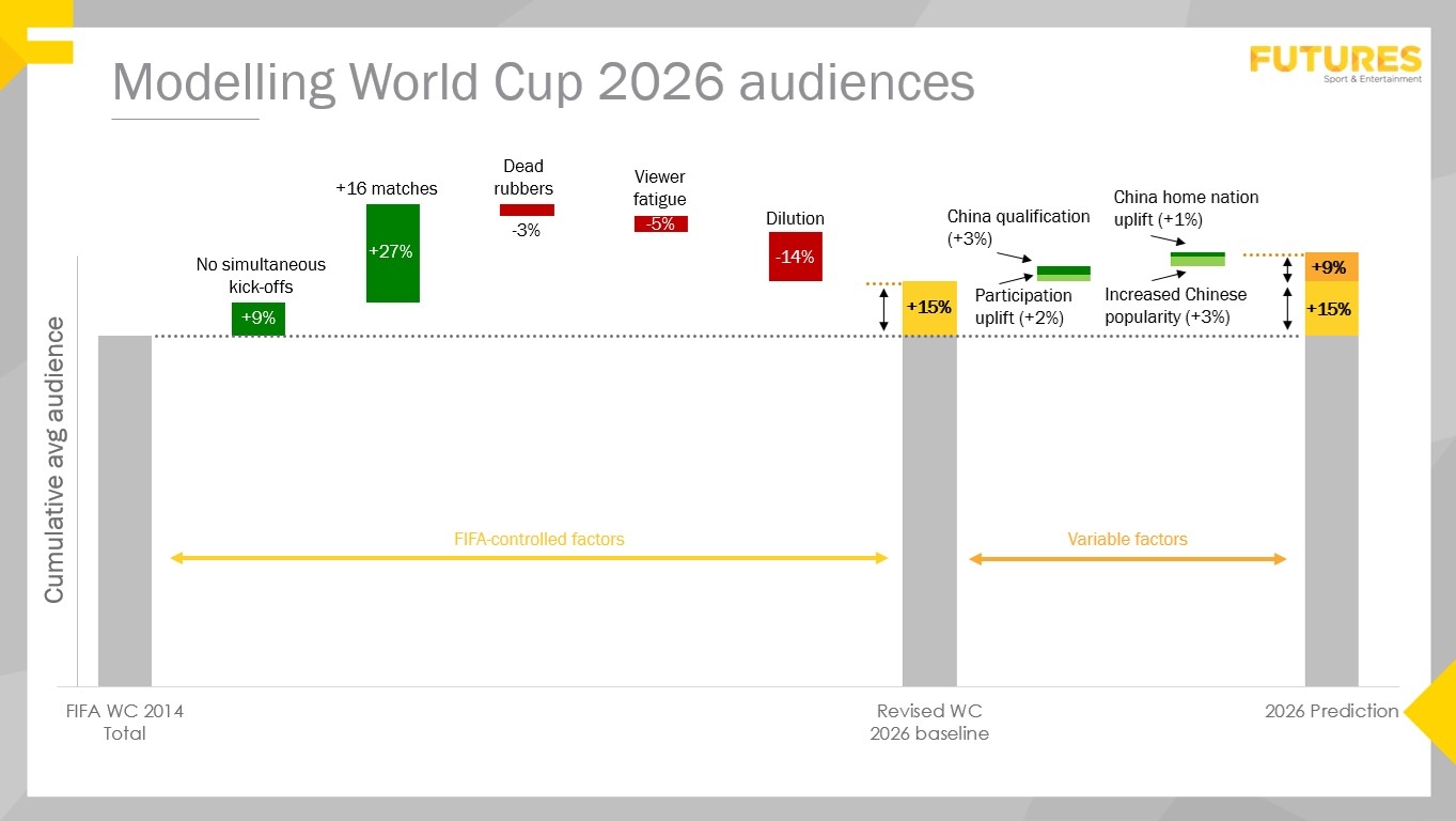 我們對16支擴(kuò)軍球隊進(jìn)行了推測。主要受益者將是亞洲和非洲國家;這兩個大洲足聯(lián)在2026年可能各自擁有9支代表隊(相比2014年分別僅有4支和5支)。在此條件下參加世界杯賽事,預(yù)計可使相關(guān)市場的收視率提升約20%,其中可能包括一些未參加過2014年巴西世界杯的人口大國,如埃及(非洲足聯(lián))和土耳其(歐洲足聯(lián))。然而,迄今為止對全球收視率影響最大的變量將是中國是否晉級。中國晉級帶來的收視提升效應(yīng),將超過其余任何15支新晉球隊組合的總和。15支球隊的市場僅使我們預(yù)測的2026年總收視率增長2%,而單單中國晉級即可帶來額外3%的增長。