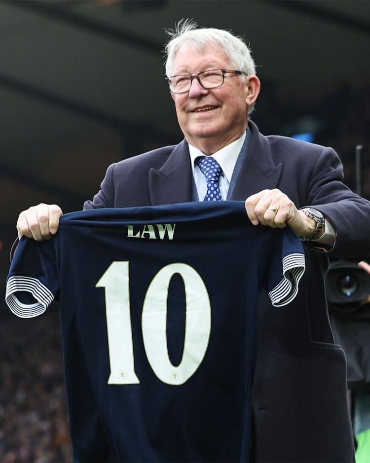 3月24日訊 當(dāng)?shù)貢r(shí)間上周末蘇格蘭對(duì)陣希臘的歐國(guó)聯(lián)賽前,弗格森手持丹尼斯-勞蘇格蘭隊(duì)10號(hào)球衣,向其致以敬意。