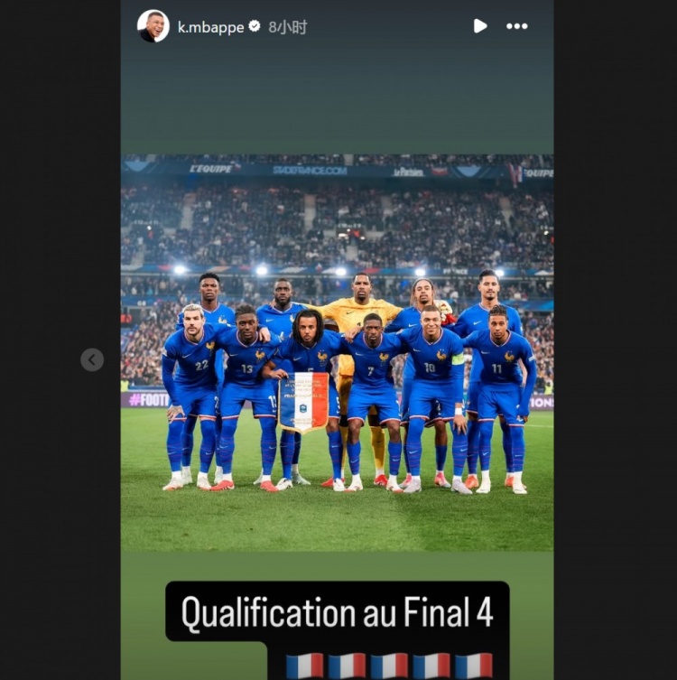 重返法國(guó)隊(duì)的姆巴佩在賽后通過(guò)社媒曬出全隊(duì)合照,并配文:“晉級(jí)四強(qiáng)!”