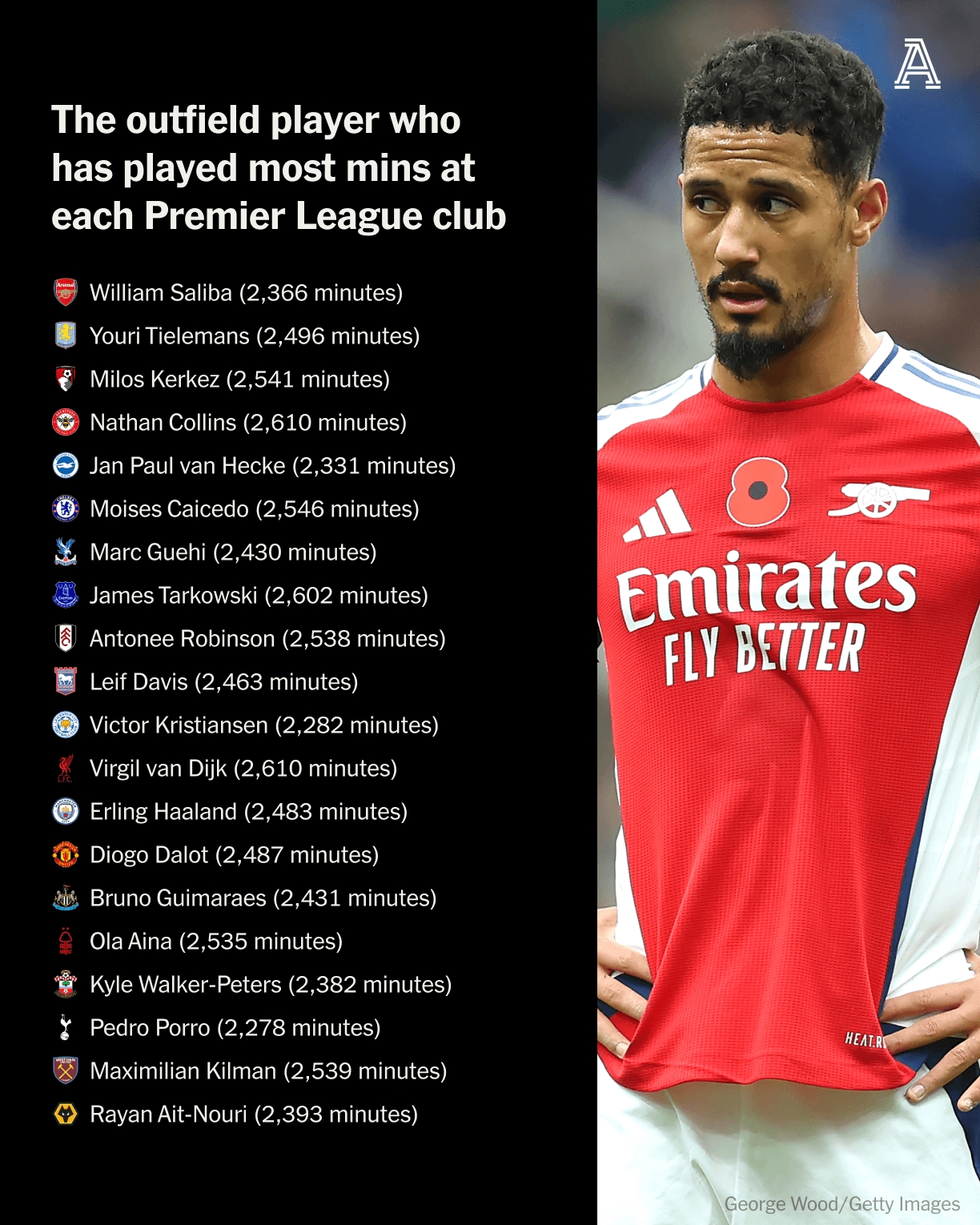 03月24日訊 The Athletic統(tǒng)計(jì)了本賽季英超各隊(duì)出場(chǎng)時(shí)間最多的外場(chǎng)(非門將)球員,薩利巴、范迪克、哈蘭德、達(dá)洛特、凱塞多在列。