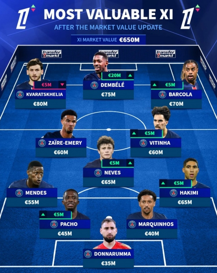 前鋒:克瓦拉茨赫利亞(8000萬(wàn)歐,下降500萬(wàn)歐)、登貝萊(7500萬(wàn)歐,上漲2000萬(wàn)歐)、巴爾科拉(7000萬(wàn)歐,上漲500萬(wàn)歐)
