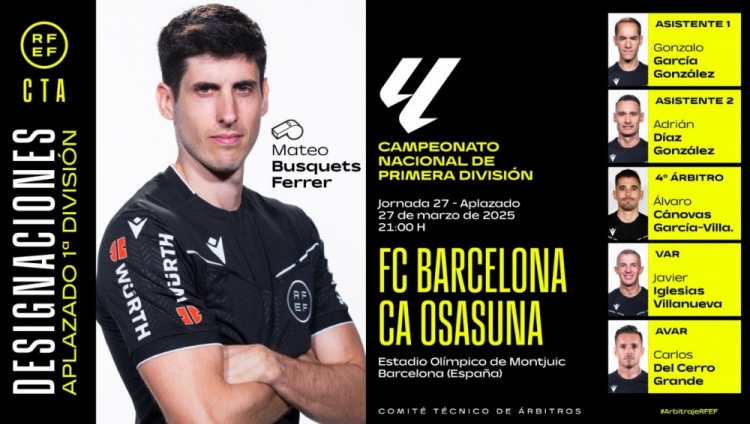 3月25日訊 北京時(shí)間328日凌晨4:00,2024-25賽季西甲第27輪補(bǔ)賽,巴塞羅那將迎戰(zhàn)奧薩蘇納。賽前,西班牙足協(xié)官方公布了本場(chǎng)比賽裁判組,費(fèi)雷爾執(zhí)法。