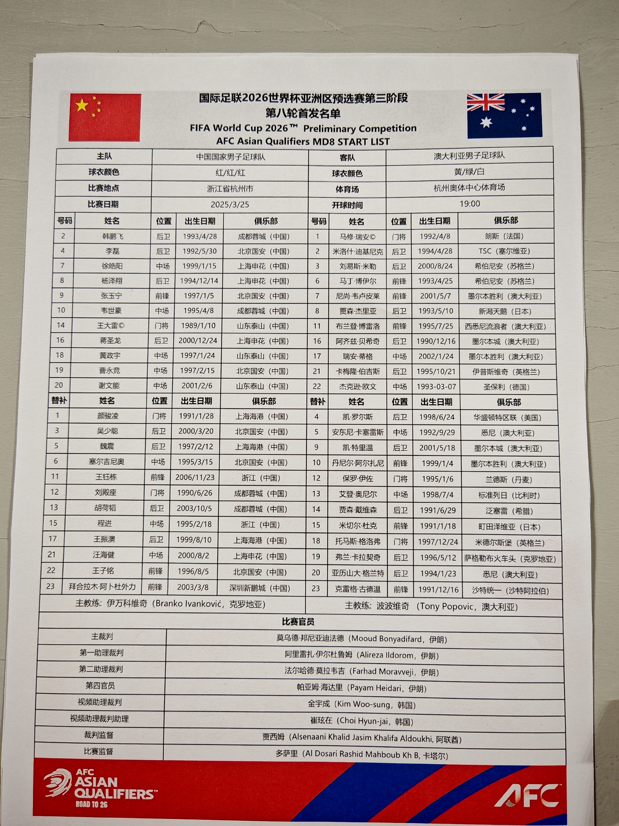 少見!中澳之戰(zhàn)首發(fā)名單為全中文版彩色