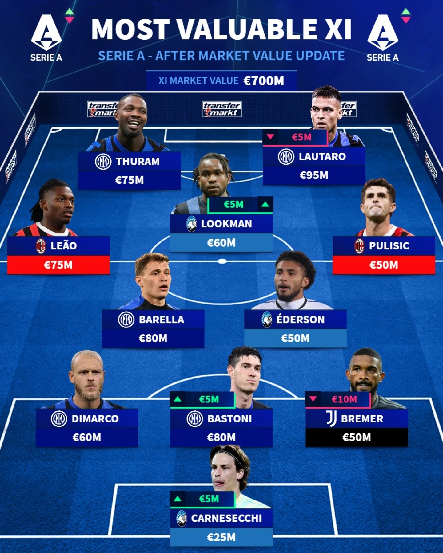 中場(chǎng):巴雷拉(國米,8000萬歐)、埃德森(亞特蘭大,5000萬歐)、萊奧(米蘭,7500萬歐)、普利西奇(米蘭,5000萬歐)、盧克曼(亞特蘭大,6000萬歐,本次+500萬歐)