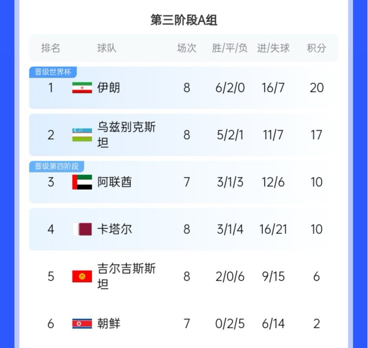 03月26日訊 世預賽亞洲區(qū)第三階段A組第8輪,塔雷米梅開二度,伊朗2-2戰(zhàn)平烏茲比克斯坦,提前晉級2026年世界杯。伊朗也成為第三支通過預選賽晉級2026世界杯的球隊,他們也將連續(xù)四屆參加世界杯正賽。目前已有6隊獲得2026世界杯參賽名額,分別是東道主3隊(美國、加拿大、墨西哥)以及日本、新西蘭和伊朗。18強賽A組積分榜: 本文標簽: 伊朗 英超 西甲 意甲 德甲 法甲 足球