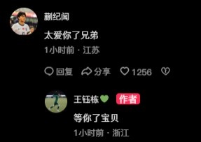 他在U20國(guó)足的隊(duì)友蒯紀(jì)聞留言“太愛你了兄弟”,王鈺棟則調(diào)侃回復(fù)“(國(guó)家隊(duì))等你了寶貝”。