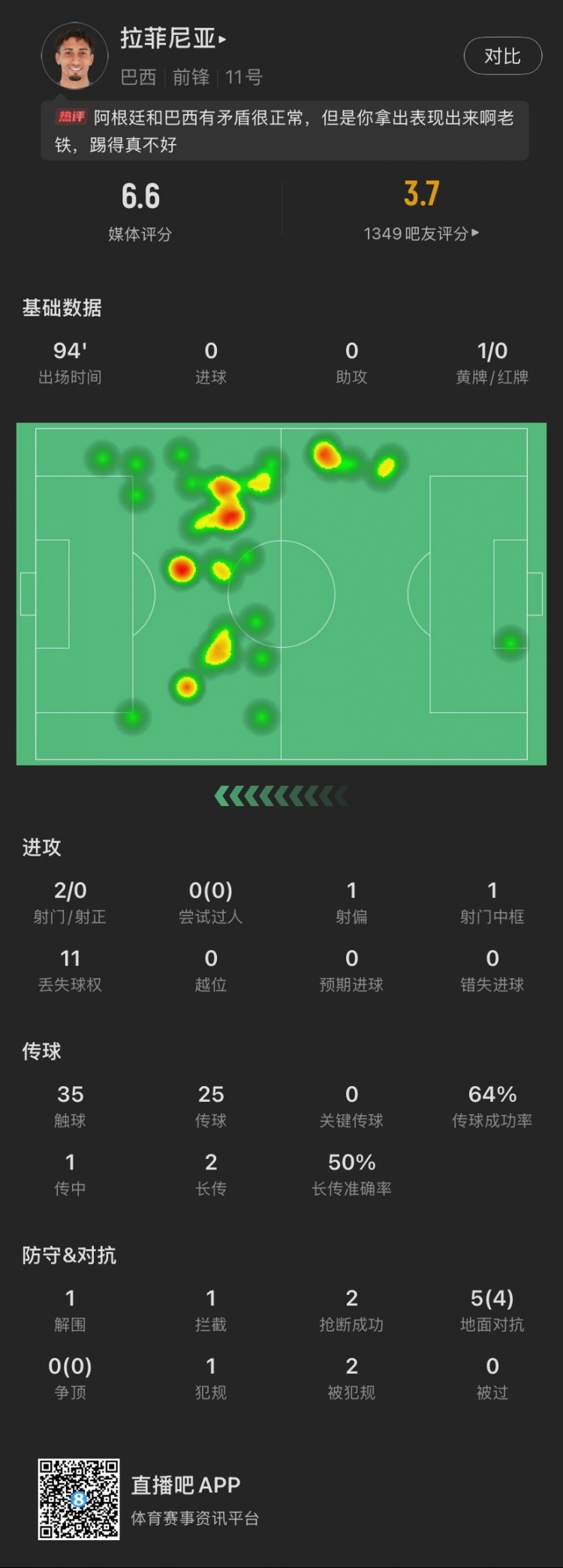 3月26日訊 在剛剛結(jié)束的世界杯預(yù)選賽中,巴西1-4不敵阿根廷。本場比賽,拉菲尼亞發(fā)揮欠佳,僅獲評(píng)6.6分,賽前他曾放狠話要“狠狠干翻阿根廷”。