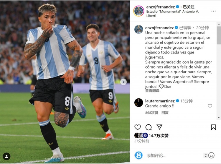 “永遠感激球迷們對我們的支持,很高興經(jīng)歷一個將被永遠銘記的夜晚。讓我們?yōu)榻酉聛淼奶魬?zhàn)將繼續(xù)努力!加油,兄弟們!加油,阿根廷!永遠團結一致!”