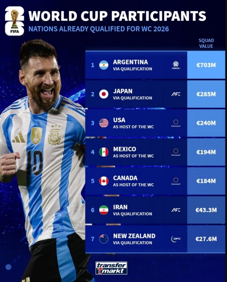 已獲世界杯參賽資格球隊(duì)身價(jià)榜: