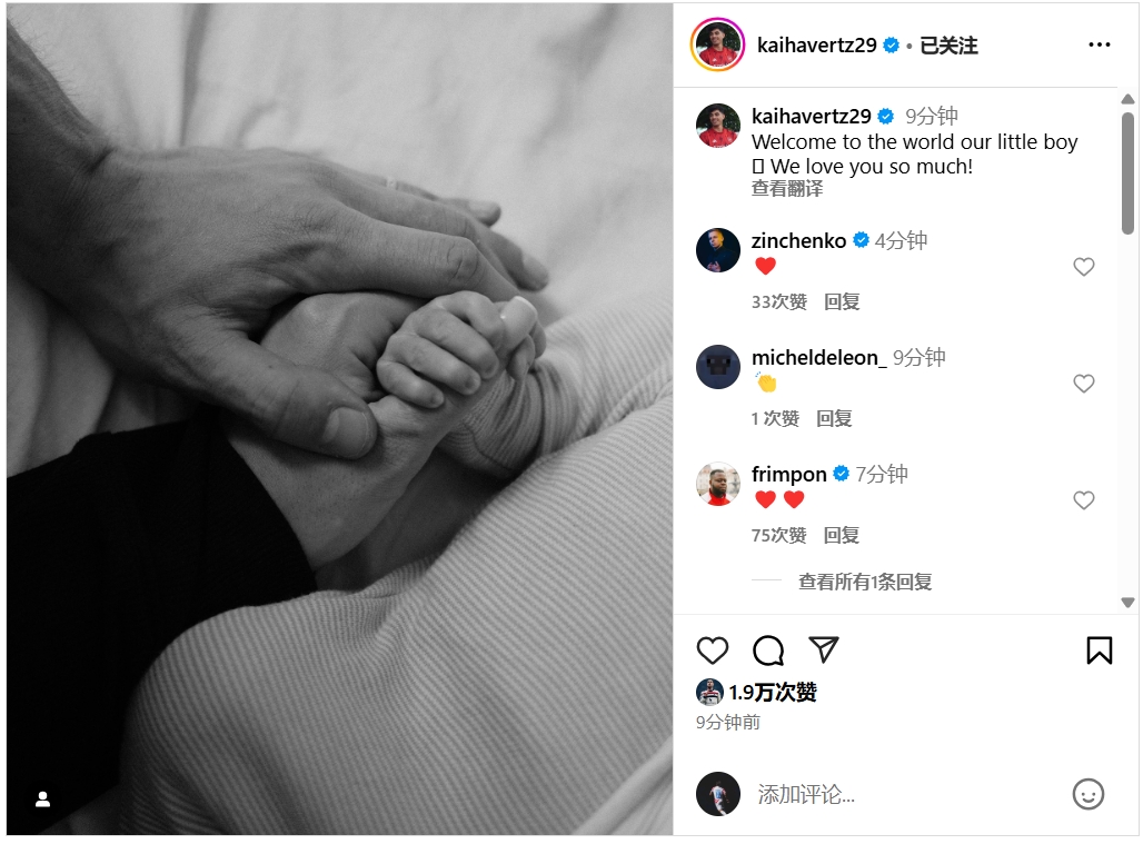 03月26日訊 哈弗茨在社交媒體曬出照片,宣布兒子的出生。哈弗茨寫道:我們的小男孩,歡迎來到這個(gè)世界。我們愛你。哈弗茨和妻子索菲婭-韋伯于去年7月舉辦婚禮,索菲婭-韋伯是一名模特,哈弗茨與她相識(shí)于2018年。去年11月,索菲婭-韋伯宣布懷孕。 本文標(biāo)簽: 足球 英超 阿森納