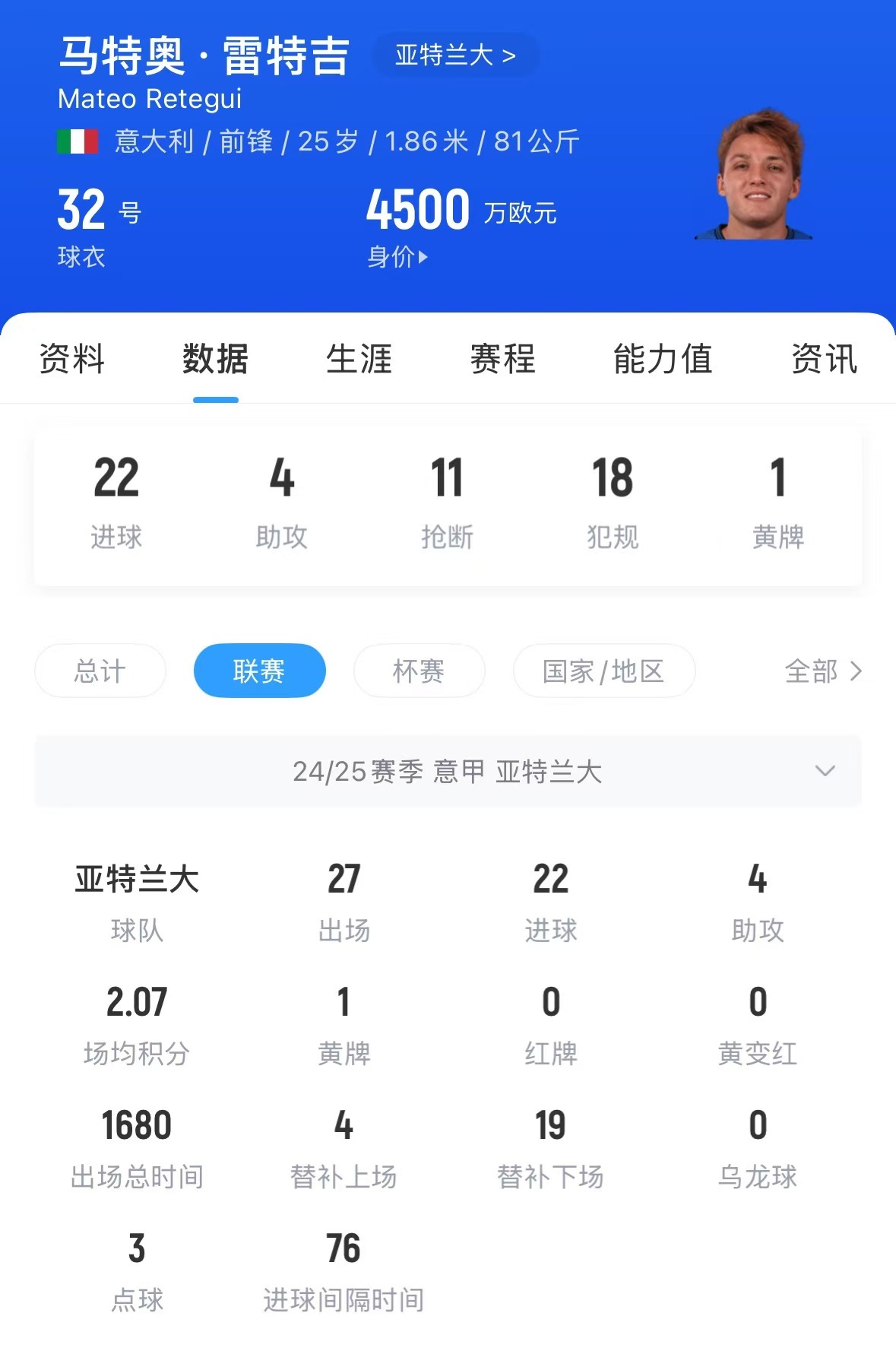 本賽季25歲的雷特吉表現(xiàn)出色,27輪意甲打進22球,斷層領(lǐng)跑聯(lián)賽射手榜,領(lǐng)先第二的小基恩7球,并幫助亞特蘭大排在意甲第三。