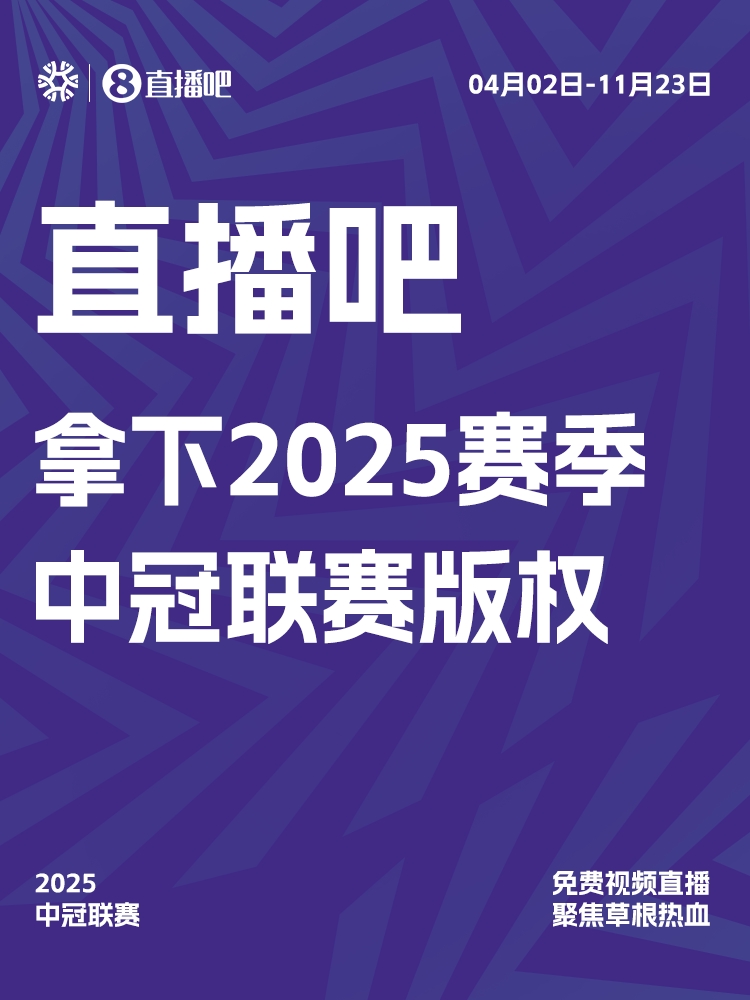 告訴吧友們一個(gè)好消息,我們拿到了2025賽季中國足協(xié)杯版權(quán)、2025賽季中國足球甲級(jí)聯(lián)賽版權(quán)、2025賽季中國足球乙級(jí)聯(lián)賽版權(quán)、2025賽季中冠聯(lián)賽版權(quán)。2025賽季,將全程免費(fèi)視頻直播足協(xié)杯、中甲、中乙、中冠四項(xiàng)賽事。上,高清比賽免費(fèi)看,與億萬吧友同頻共振!