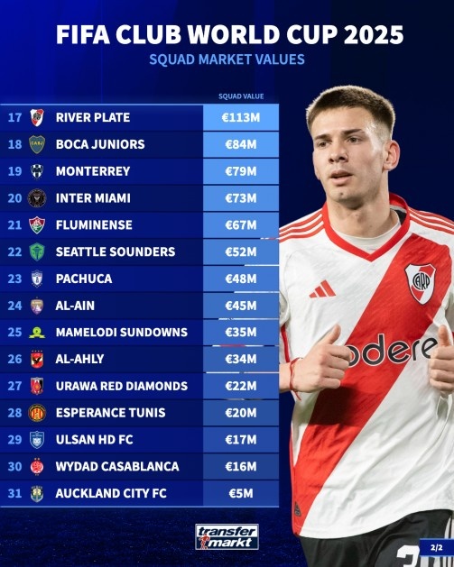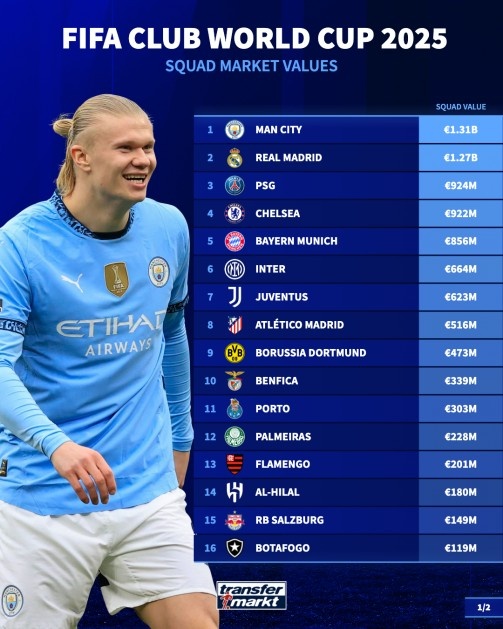世俱杯參賽球隊(duì)身價(jià)排名: