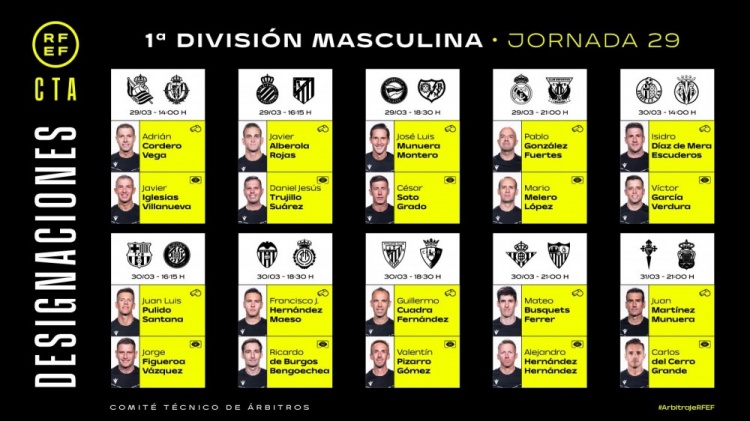 西甲第29輪裁判安排