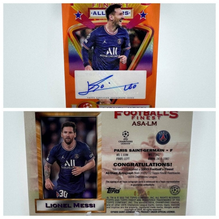 這張2021-22賽季Topps Finest Flashbacks UEFA Champions League Football’s Finest全明星簽名橙折射卡,全球僅印制10張。正面小字標(biāo)注著“Topps認(rèn)證簽名版本”。卡片背面還提供了更多保證:“所有Topps簽名卡的簽署過程均有Topps代表現(xiàn)場(chǎng)監(jiān)督,確保真實(shí)性?!边@張卡片潛在價(jià)值超過1000美元。