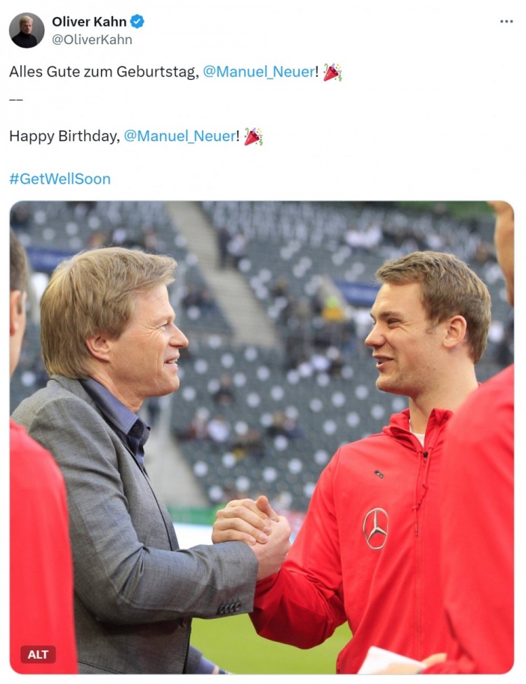 3月27日訊 今天是諾伊爾的39歲生日,拜仁傳奇門將卡恩社媒為他送上祝福。卡恩社媒曬出與諾伊爾的合照,配文:“生日快樂,諾伊爾!”諾伊爾2011年效力拜仁至今,為球隊出戰(zhàn)554場比賽,丟掉453球,完成262場零封,幫助拜仁贏得28座冠軍獎杯,其中包括11座德甲獎杯和2座歐冠獎杯。 本文標簽: 足球 德甲 拜仁慕尼黑