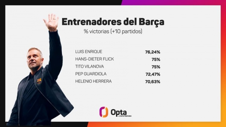 數(shù)據(jù)統(tǒng)計(jì)顯示,弗里克在巴薩各項(xiàng)賽事44場(chǎng)取得33勝,75%勝率追平比拉諾瓦。在隊(duì)史執(zhí)教超過10場(chǎng)的教練中,勝率僅次于恩里克(76.24%)。瓜迪奧拉勝率72.47%位列第四,埃倫尼奧-埃雷拉以70.63%勝率位列第五。
