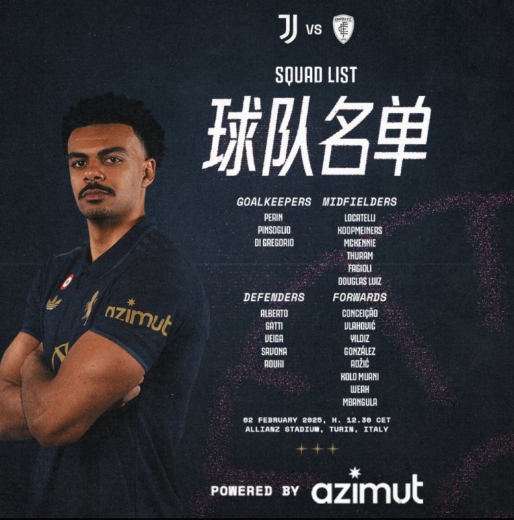 2月2日訊 北京時(shí)間今晚19:30,尤文將在主場(chǎng)對(duì)陣恩波利。賽前,尤文官方公布了將出戰(zhàn)本場(chǎng)比賽的大名單。由于正值蛇年春節(jié),尤文還特地在名單中用了漢字。