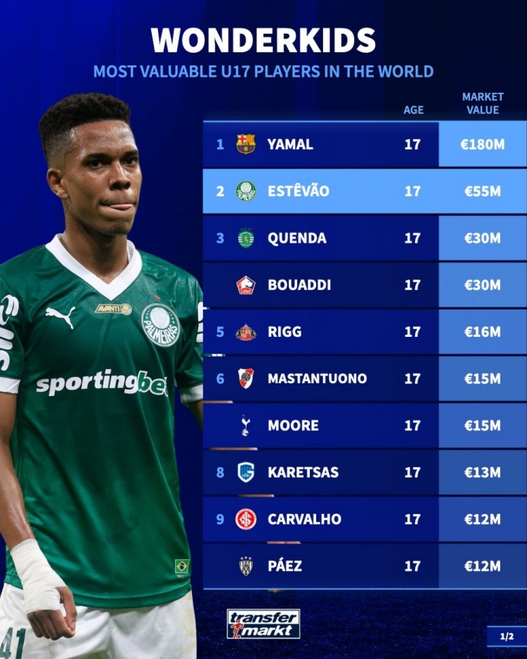3月29日訊 《轉(zhuǎn)會(huì)市場(chǎng)》完成了球員身價(jià)更新,并列出了U17球員身價(jià)榜,亞馬爾無(wú)懸念斷崖領(lǐng)跑,多位球員已經(jīng)被切爾西預(yù)訂。