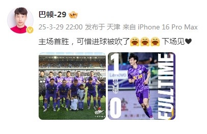 3月29日訊 在中超聯(lián)賽第3輪中,天津津門(mén)虎1-0戰(zhàn)勝青島海牛,本場(chǎng)比賽也是天津津門(mén)虎本賽季的主場(chǎng)首勝。賽后津門(mén)虎主力巴頓更新微博表示“主場(chǎng)首勝,可惜進(jìn)球被吹了”,同時(shí)他也不忘向球迷預(yù)告“下場(chǎng)見(jiàn)”。