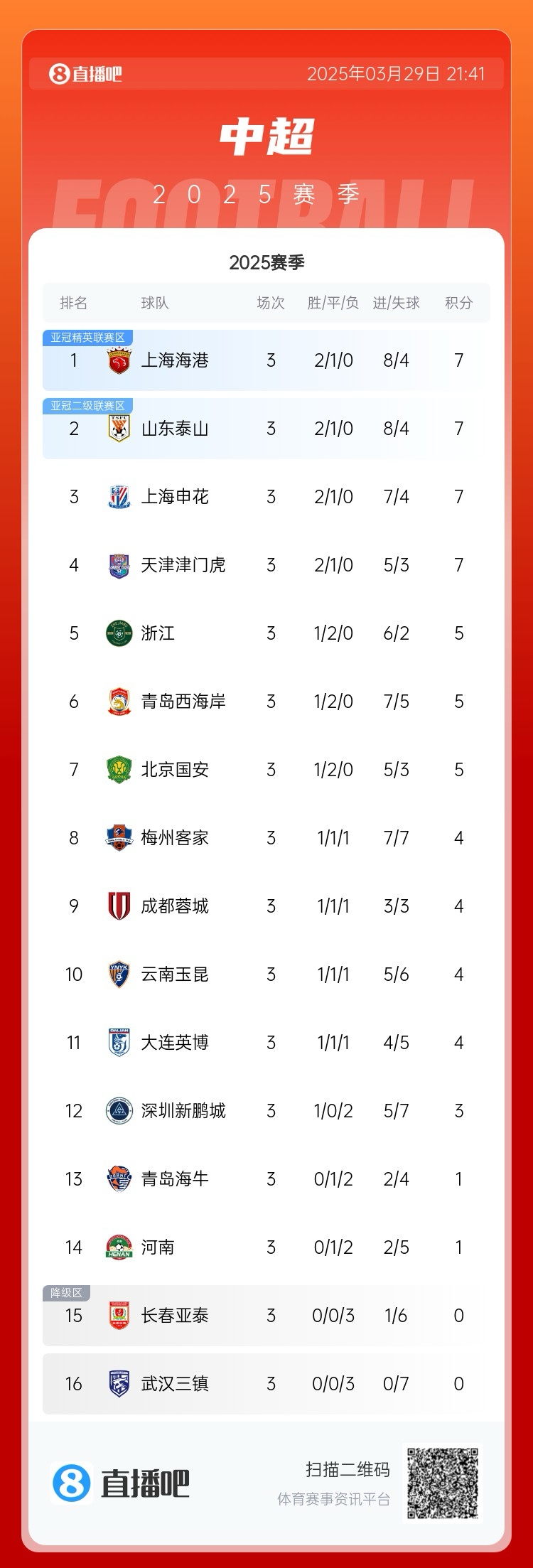 03月29日訊 中超第三輪已全部結(jié)束,本輪中超8場比賽共打入了33粒進球,場均超過4球。其中,僅有三場比賽少于3個進球。另有三場比賽至少產(chǎn)生6個進球。本輪賽果↓積分榜↓ 本文標(biāo)簽: 足球 中超 中國足球 武漢三鎮(zhèn) 天津津門虎 青島西海岸 大連英博 梅州客家 山東泰山 浙江 上海申花 云南玉昆 長春亞泰 上海海港 成都蓉城 青島海牛 深圳新鵬城 北京國安 河南
